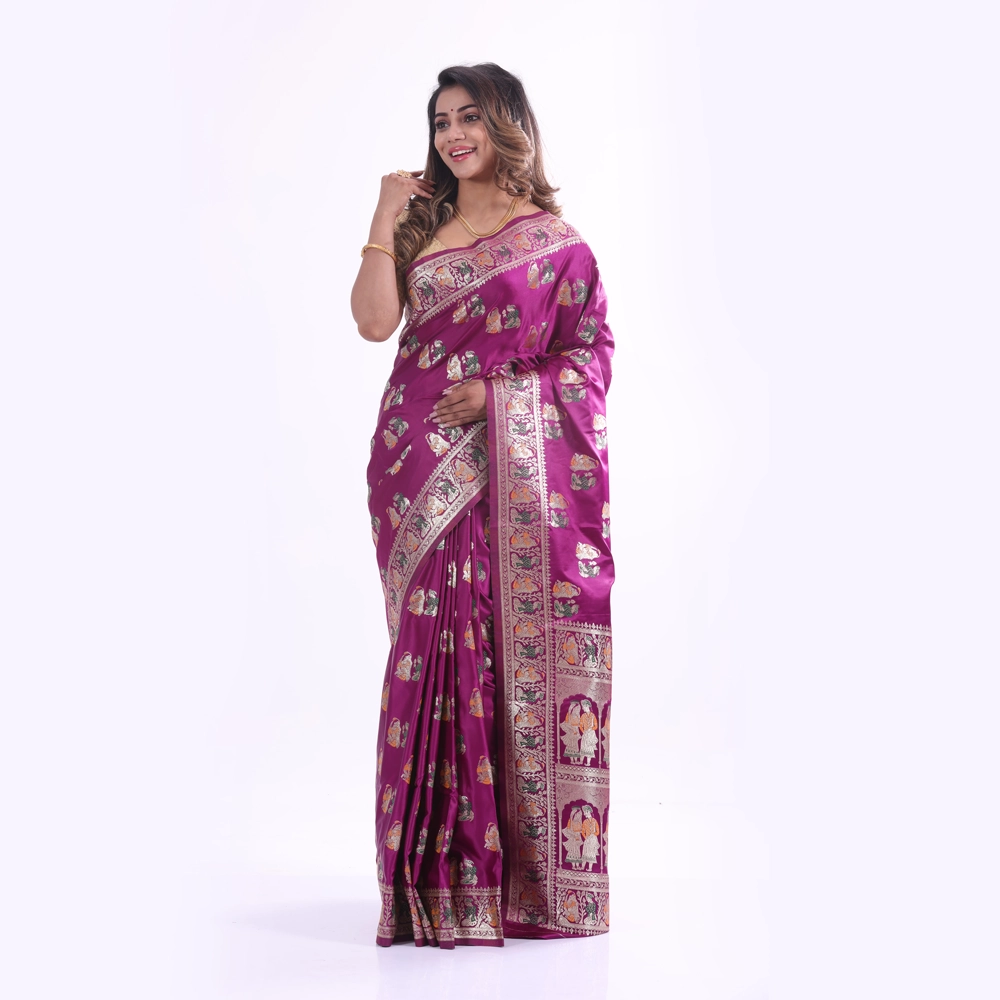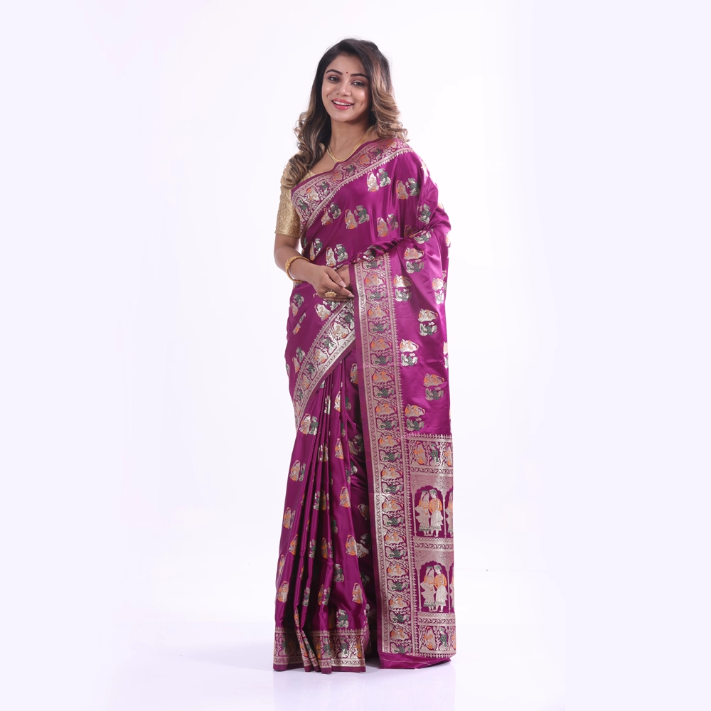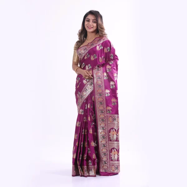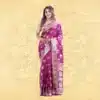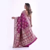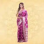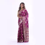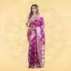 This stunning royal purple synthetic saree features intricate gold zari work and traditional motifs along the border, creating an elegant and festive look. Perfect for weddings, festivals, and other special occasions for a complete traditional ensemble.